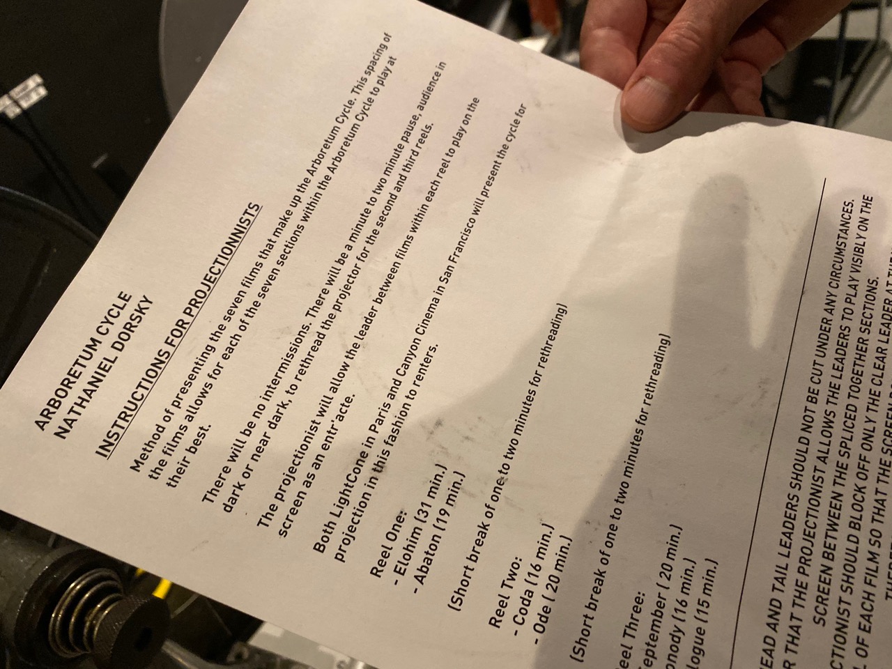 Dorsky has restricted the availability of his films to analogue screenings. The films are 16mm prints of his silent films which must be projected at the ‘silent speed’ of 18fps. The prints had come from LightCone in Paris accompanied by strict guidelines for the screening which specified the films’ order, the brightness of the cinema, that the leaders must be left intact when the three larger reels were made up by the projectionist etc.