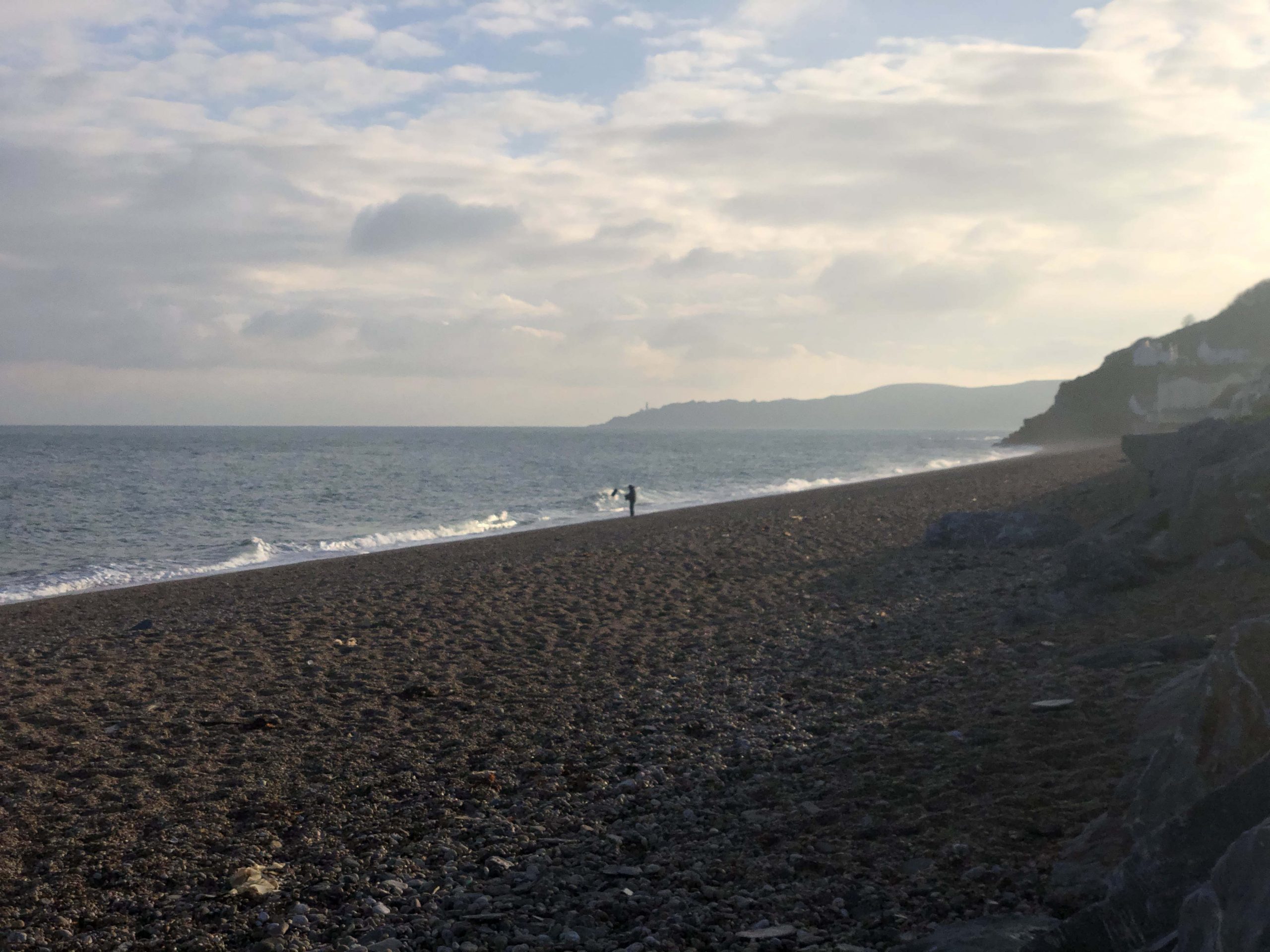 Slapton Sands standing in for Dungeness to record voiceover. A bitterly cold day for sound recording in south Devon in December 2020, using a Sennheiser MS stereo pair in a Rycote windshield recording on a Zoom F4.