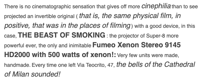 There is no more cinephilic sensation than to see projected a reversal original ( that is, the same physical film, in positive, that was in the places of filming ) with a good device, in this case, THE BEAST OF A FUMEO : the most powerful Super 8 projector ever, the only and inimitable Fumeo Xenon Stereo 9145 HD2000 with 500 watts of xenon!: Very few units were made, all handmade. Every time one left Via Teocrito, 47, the bells of Milan Cathedral sounded!